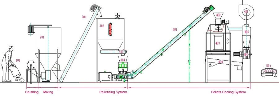 - As shown in the Figure 1, the maize and soya bean meal (store & directly feed on ground) is sucked into the Grinding Machine 101 and crushed into fine powder. Any other powder/soft materials, such as wheat bran, bone meal, microelement, vitamin, etc, which don’t need to be crushed, they can directly feed into the Vertical Mixing Machine 201 from its feeding port. All materials are mixed uniformly and discharged into the hopper of Screw Conveyor 301 then feed into Temporary Storage Silo 302 by screw conveyor. By Screw Feeder 303, the mixed materials are uniformly and continuously feed into the animal feed pellet machine 304 then produced into feed pellets. The pellets are discharged into the hopper of Belt Conveyor 401 then feed into the Pellet Cooling Machine 403 through Air Lock 402. With the cooling process, the fresh & hot pellets are cooled, the pellet temperature is not more 5℃ than the room temperature. The cooled animal feed pellets are screened by the Vibrating Screen 404, then they can be packaged.